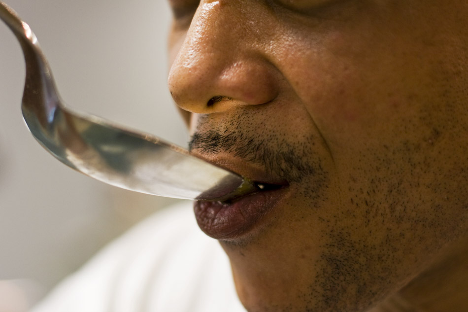 Treat America grill cook Donald Whiteside samples the chili in the Meramec cafeteria on May 3. Whiteside has a cook with Treat America since November 2010. “I like dealing with the public and working with food,” said Whiteside. “I’m a machinest by trade and just got into cooking.”