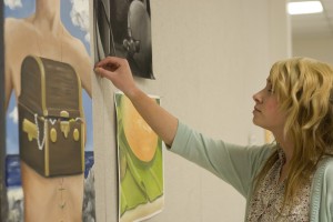 Kelly O’Keefe pins up a piece of artwork. O’Keefe studies art at Meramec and plans on freelancing as a career.