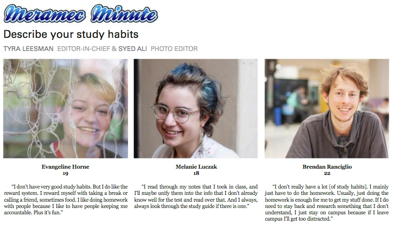 Art & LifeMeramec Minute Oliver Pulcher7 years ago7 years ago01 mins Describe Your Study Habits By: TYRA LEESMAN EDITOR-IN-CHIEF and SYED ALI PHOTO EDITOR: Post navigation Previous: Grounding and centering:Next: How To Be Healthy