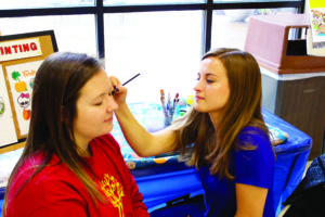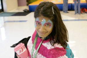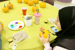 Cafeteria tables were set up for pumpkin painting as a safer alternative to carving jack-o’-lanterns. The tables were also covered in fall-themed spreads to protect them from paint splatters and spills. Games included inflatable Twister, Jenga and Wii Dance Revolution for everyone to enjoy.
