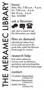 The library at Meramec provides other services as well. If you have a question, you can call, e-mail or chat with a member of the library staff. On the library’s webpage is a list recent acquisitions that can be browsed. Their website offers research assistance, and they can schedule library literacy classes with campus instructors. In addition , the library hosts many educational events on the campus.