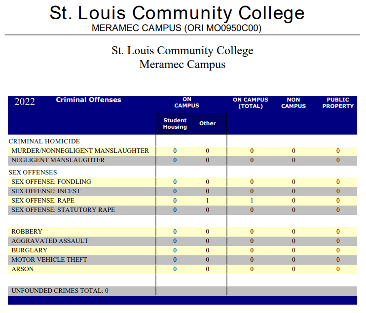 Saint Louis Community College (STLCC) recently published its 2023 Security and Fire Safety Report. This report, published in accordance with the Clery Act of 1990, details the statistics of all crimes and incidents reported that are associated with the college over the previous three years. The 168-page report has crime and incident statistics that cover every single STLCC campus; specific data relating to the Meramec Campus can be found on pages 121-132 of the report.