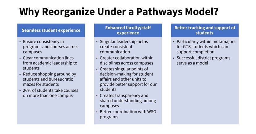 “There’s no plan to move faculty in what’s in front of us,” he said. “This is really a plan about making sure it’s clear how faculty across the district connect and who leads them. And making sure that structure is ‘One College’ and with a Pathways lens on it.”