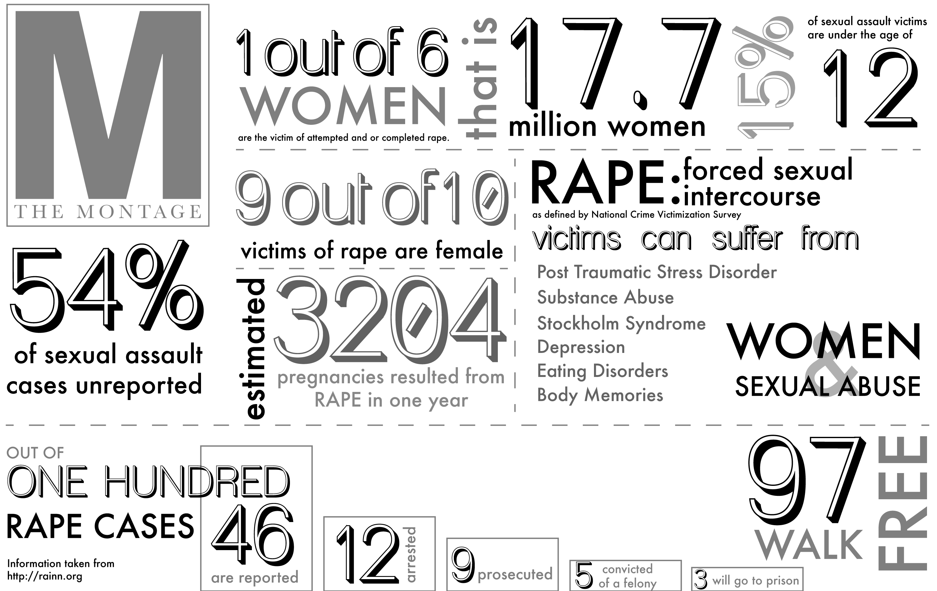 Rape, no matter how it is portrayed in the media, is not commonly committed by strangers. Many reported incidents (approximately 26 perent according to the U.S. Bureau of Justice) occur in the victims’ home; 38 percent of sexual assault crimes are perpetrated by a friend or acquaintance of the victim. Despite the high numbers of assaults per year in the US (over 191,000 in 2005), only 25 perent of these reports result in arrests: the victims sometimes recant, the victims cannot afford rape kits, or the victims decide not to press charges.