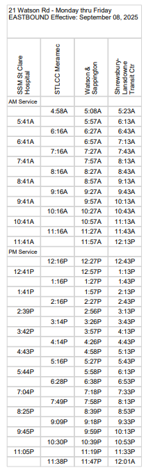 Metro evaluates and sometimes readjusts routes on a quarterly basis. There are no changes to the #56- Kirkwood/Webster route for this cycle. Take a look at the new detailed weekday schedule for Route #21 below: