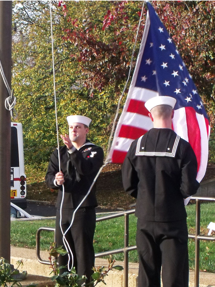 Jesse Gunderson, left, and Lee Newbold, right, hoist the flag during a Veterans Day ceremony held by the STLCC-Meramec Student Veterans Association on Nov. 11 in the circle drive in front of campus.