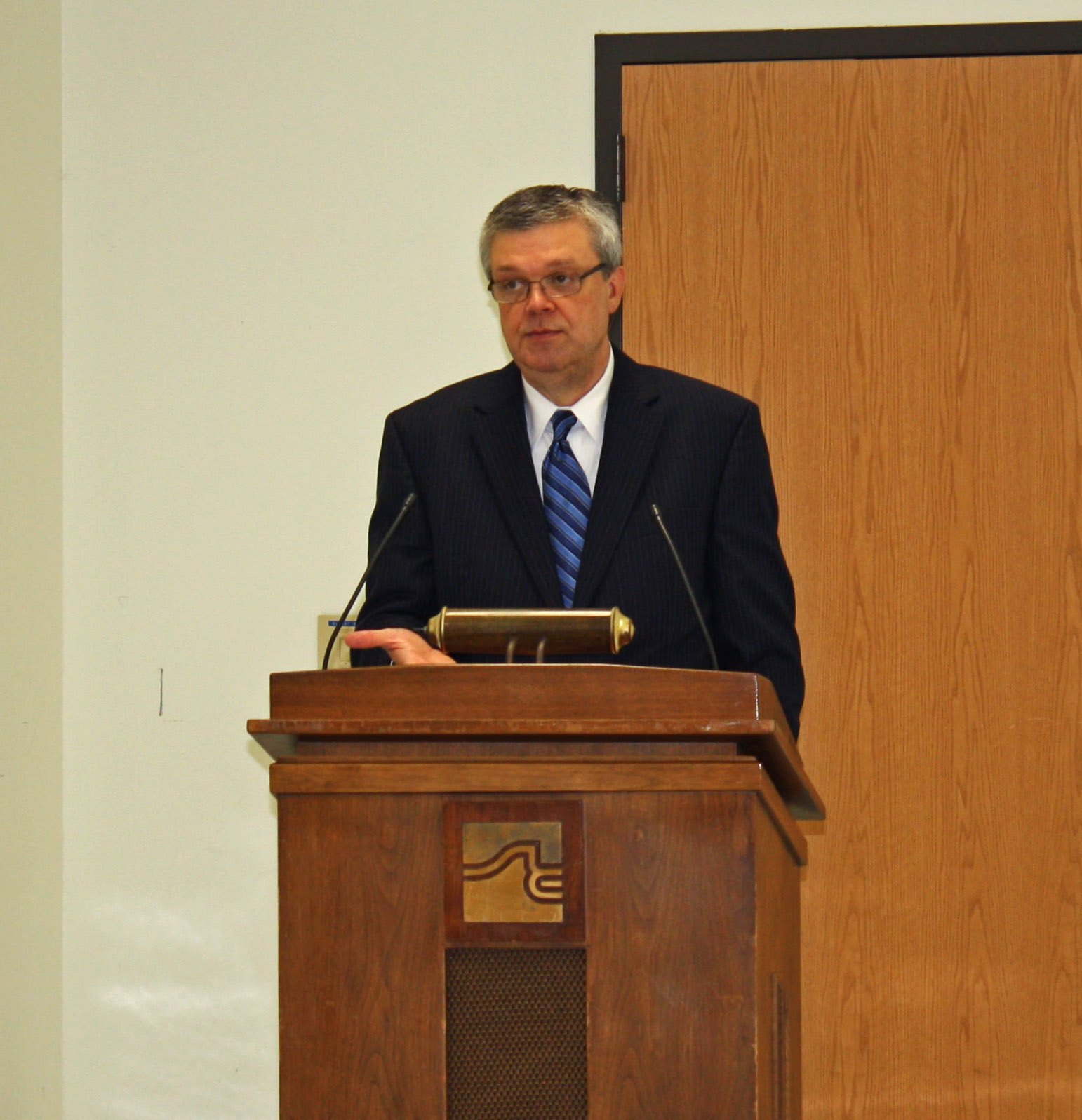 Keith Branham, candidate to become the new Vice President of Student Affairs, addresses the crowd during a forum held in SC 201 on June 1. A forum was held for each candidate to allow students, faculty and the public to ask questions. | KURT OBERREITHER