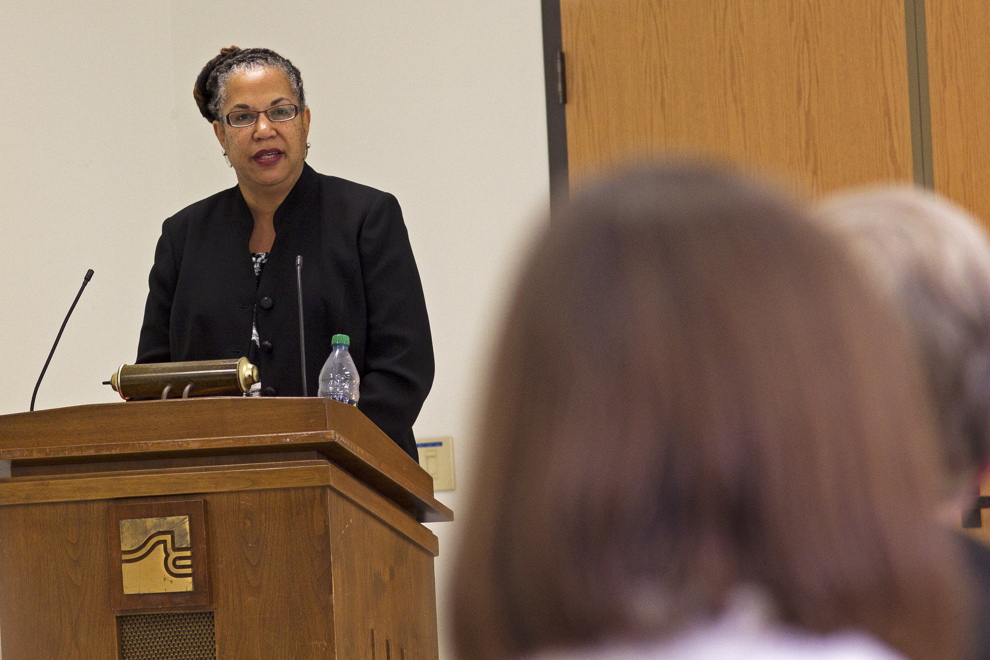 Lin Crawford, interim Vice President of Student Affairs, answers questions from the crowd during a forum held in SC 201 on June 1. The forums were held from June 1-2 to select a permanent canidate for the position. | HANS STEINERT