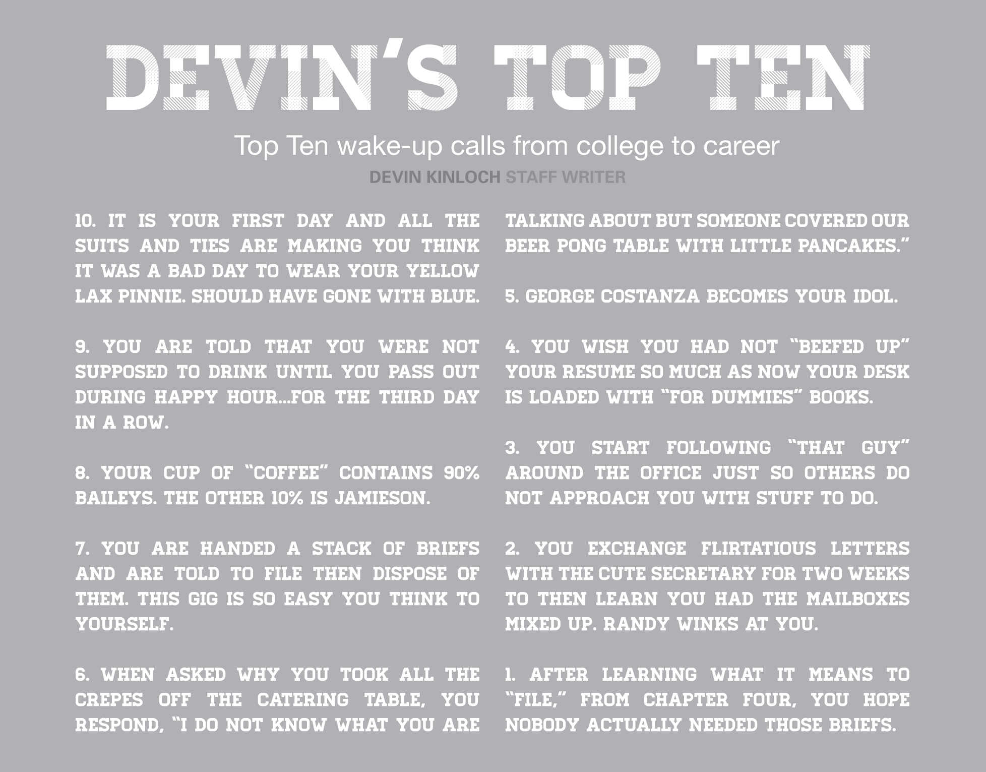 • Devin’s Top Ten; Top Ten wake-up calls from college to career