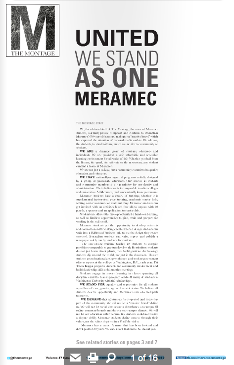 We, the editorial staff of The Montage, the voice of Meramec students, solemnly pledge to uphold and continue to strengthen Meramec’s 50-year-old reputation, despite a “massive brawl” which has captured the attention of national media outlets. We ask you, the students, to stand with us, united as one diverse community of scholars.