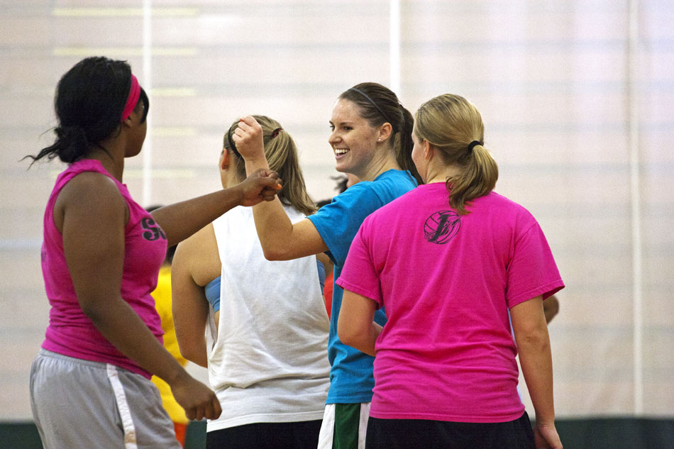 Lauren Fischer, middle, congratulates teammates during practice at Meramec on Sept. 26 after a give-and-go basketball drill. Both the menâs and womenâs basketball teams have been forced to practice at Meramec, while new renovations are being made to the Archers home-court at STLCC-Forest Park. Fischer played for the Rockwood Summit Falcons last season, scoring 204 points, with 128 rebounds. The lady Archers begin their season at home during exhibition on Nov. 1. The is the first season of the Archers.