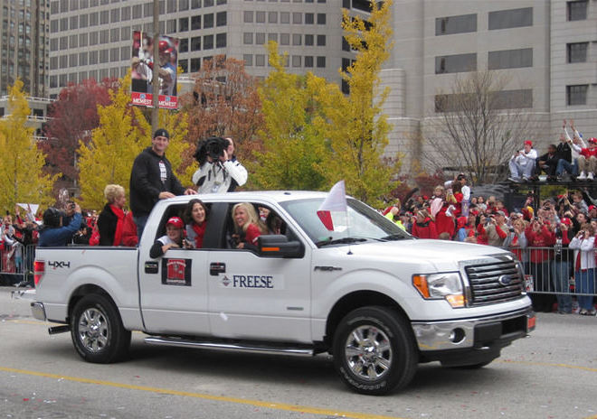 St. Louis Cardinal third baseman David Freese waves to the tens of thousands of Cardinal fans during the World Series victory parade on Sunday, Oct. 30 from the bed of a Ford pick-up truck. Freese's .397 batting average and 21 runs batted in during the postseason earned him both the national League Championship Series MVP and World Series MVP awards. He became only the sixth player tin baseball history to earn both awards in the same postseason and the second Cardinal player. Darryl Porter achieved both honors in 1982. As a STLCC-Meramec Magic baseball player in 2004, Freese hit .396 with 41 RBI's and 10 home runs. During his senior season at Lafayette High School, Freese set school records in batting average, hitting .533, and home runs, with 23. Freese was drafted by the San Diego Padres in the ninth round of the 2006 First-Year Player Draft and then traded to the hometown team in 2007 for Jim Edmonds. During the regular season, Freese hit .297 with 10 home runs and 55 RBI's. PHOTO | Nick Rousseau